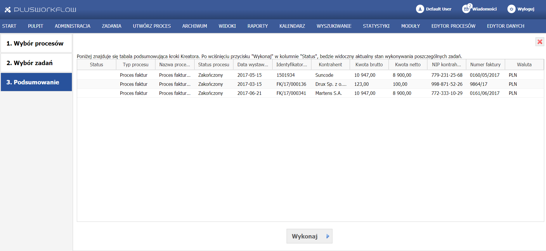 Po wskazaniu już zadania należy wybrać przycisk dalej i użytkownik zostaje przeniesiony do ostatniego kroku, podsumowania przywrócenia procesu. W tym momencie jeszcze jest możliwe cofnięcie do innego etapu w aplikacji. Po wybraniu przycisku Wykonaj system rozpocznie przywracanie procesu na wybrane zadania. W przypadku, gdy system natrafi na sytuacje kiedy proces nie może zostać przywrócony poinformuje o tym fakcie użytkownika. Możliwe statusy jakie mogą się pojawić to: